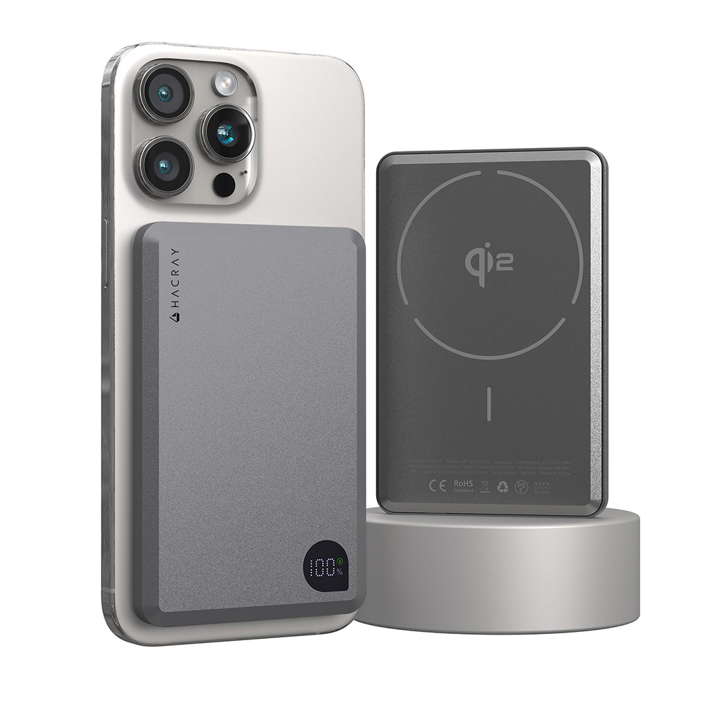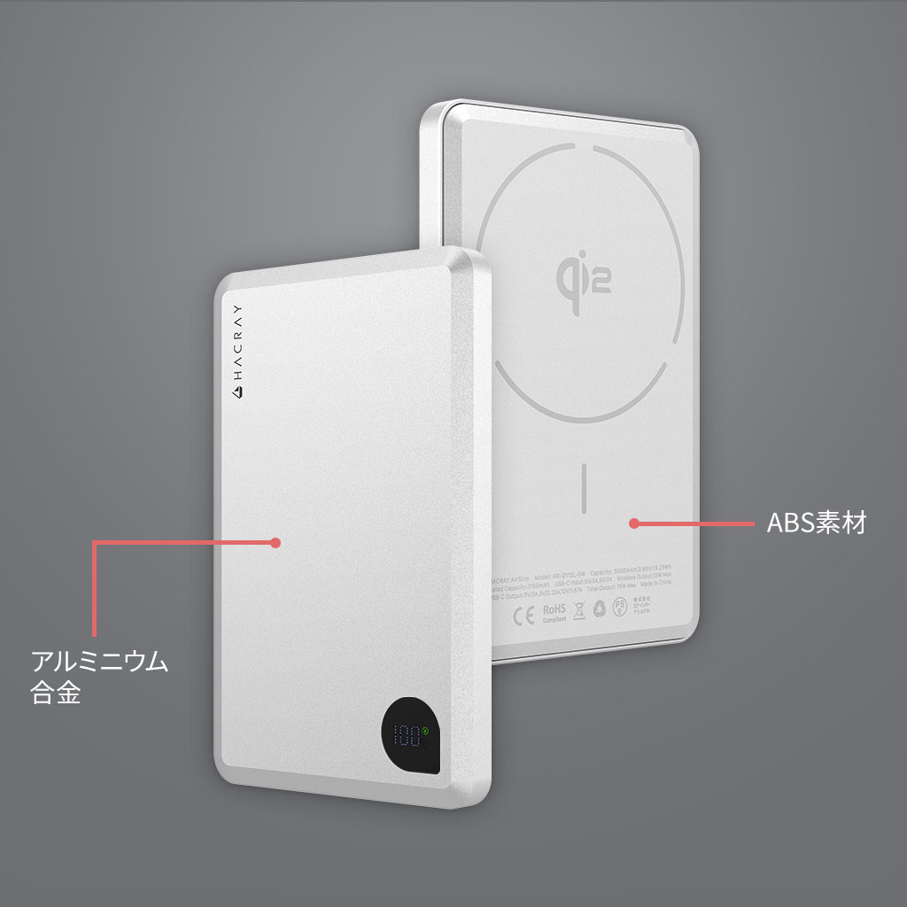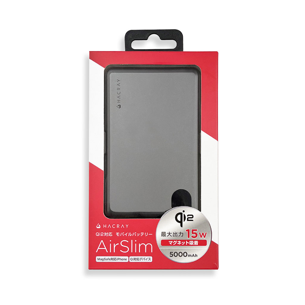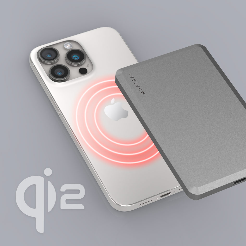 Hacray モバイルバッテリー AirSlimは、Qi2公式認証を取得した最大15Wワイヤレス充電対応の次世代モバイルバッテリーです。