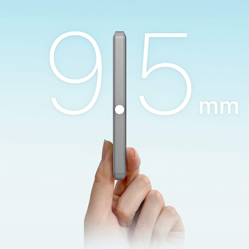 わずか116g・薄さ9.5mmのコンパクト設計で、スマホを使いながらの充電も快適。ポケットや小さなバッグにもすっきり収まります。 スリムな形状ながら、熱がこもりにくい最適な構造に設計。安全性にも配慮しています。