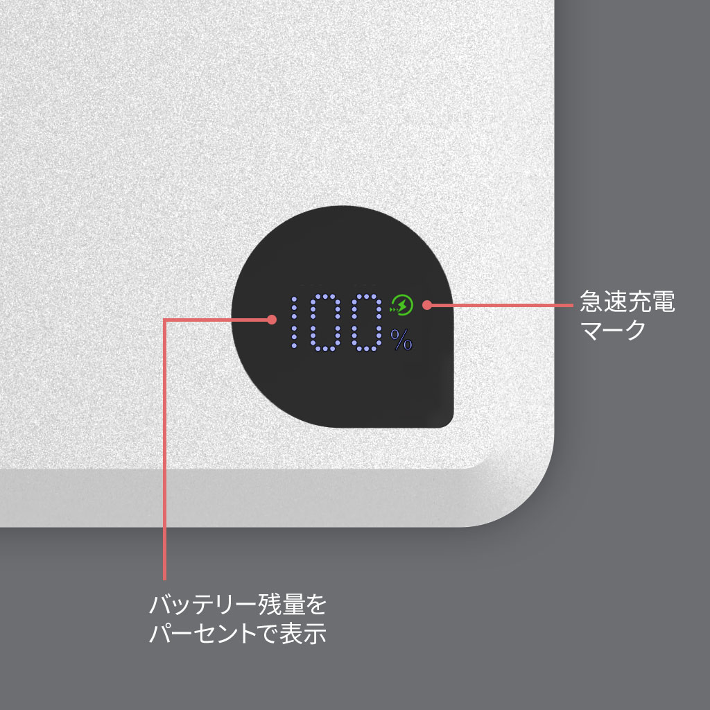 本体表面のLEDディスプレイが、バッテリー残量を数値でわかりやすく表示。充電のタイミングを逃さず、いつでも安心して使用できます。